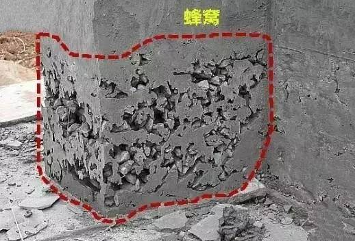 蜂窝有表面的、深井的和贯通的三种,也常遇到水平的、倾斜的、斜交的单独蜂窝和相连的蜂窝群,其表现为局部表面酥松,无水泥浆,粗骨料外露深度大于5mm(小于混凝土保护层厚度),石子间存在小于最大石子粒径的空隙,呈蜂窝状,有蜂窝处的混凝土强度很低。